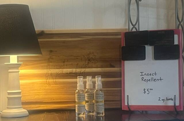Insect repellent ingredients are avocado oil, water, peppermint oil, and lemongrass oil. Shake well before use. Price is $5.00 for 2 oz spray bottle.